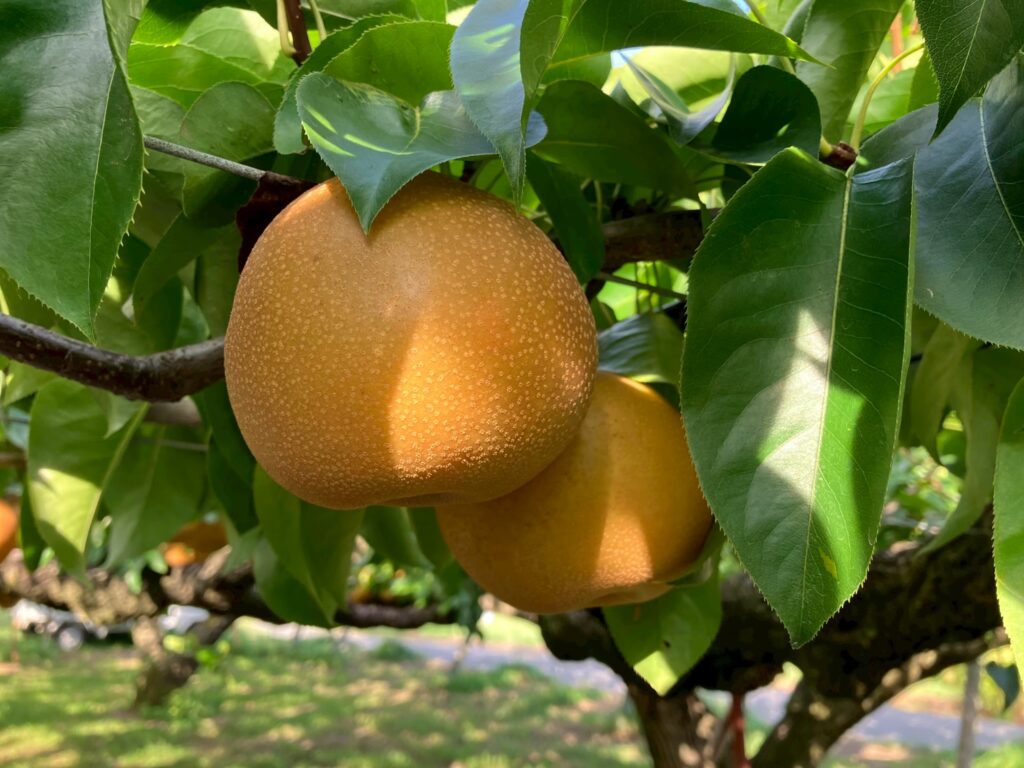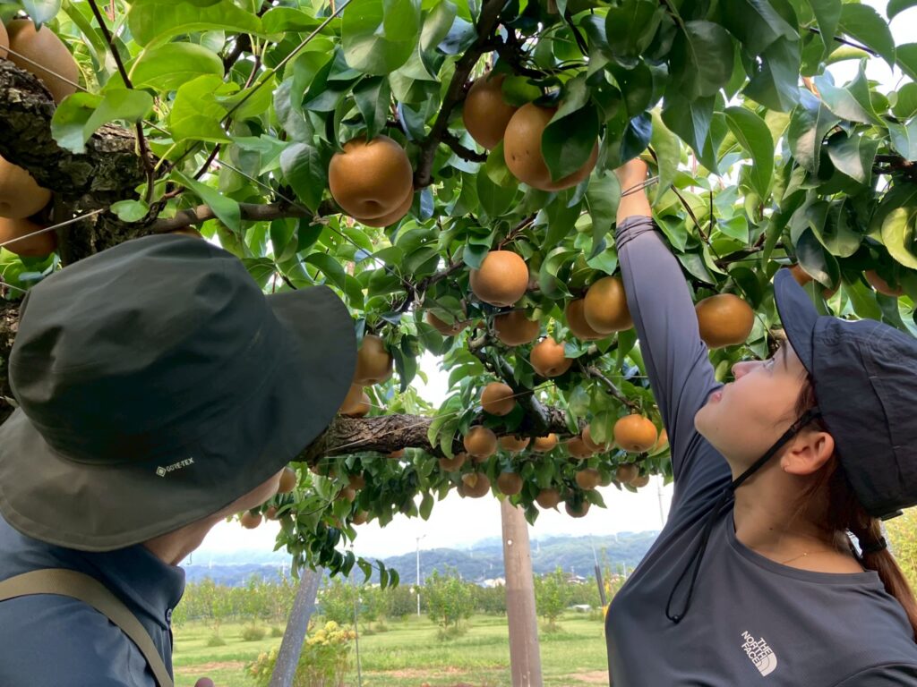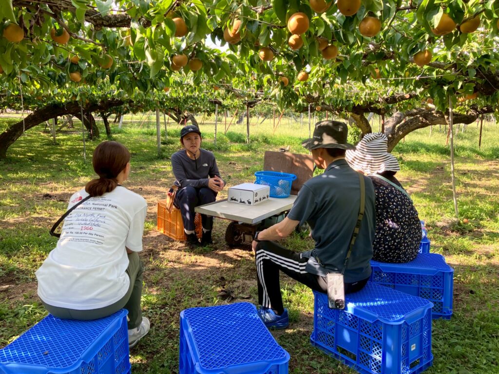 今回は、松川町役場担当者による町内案内からスタートして、3軒の農家さんを訪ねました。最初に訪ねたのは「ぬいぬい農園」の乾真緒さん。「将来どうしようかと考えていた時期に、松川町で南水(梨)を食べたときの美味しさに驚きました。そして、松川町の方の優しさに触れて、自分ひとりでもやっていけるかもしれない、と思って2年前に移住しました。」という乾さん。美味しそうに実った南水の果樹園の下で、移住当初のお話やくだものづくりにかける思いをたっぷり語っていただきました。