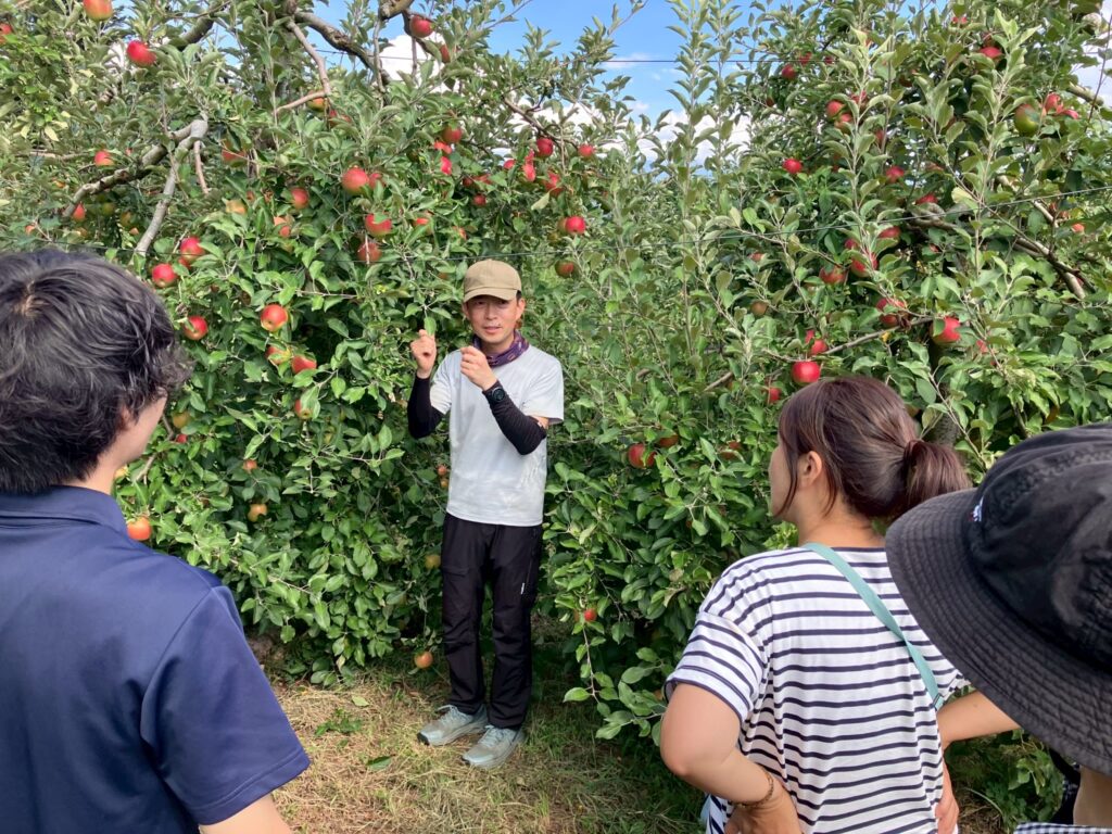 翌日は、先代からの果樹園を受け継いで、主にりんごを作っている「やまき北村農園」の北村朝子さんを訪ねました。「自然相手なので、毎年同じことは起きません。逆に来年はこうしたいと毎年思える楽しさがあります。」「子どもの頃から両親が苦労してきた姿を見てきました。失敗しながらもその都度勉強しながら経験値を上げてきました。」と、くだものづくりの大変さややりがい、農家として大切にしている姿勢などのお話を伺いました。