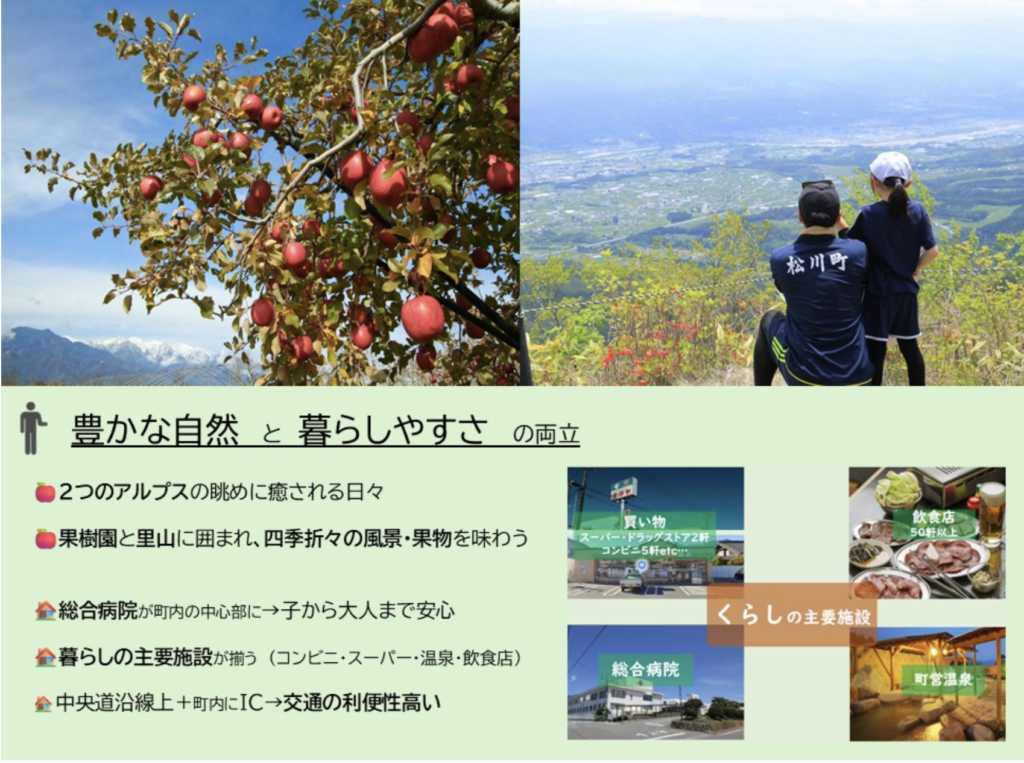 松川町は、2つのアルプスに囲まれた豊かな自然と、果樹栽培が盛んであるため、「雄大な自然と農を体感しながらのびのびと暮らす」ことができます。